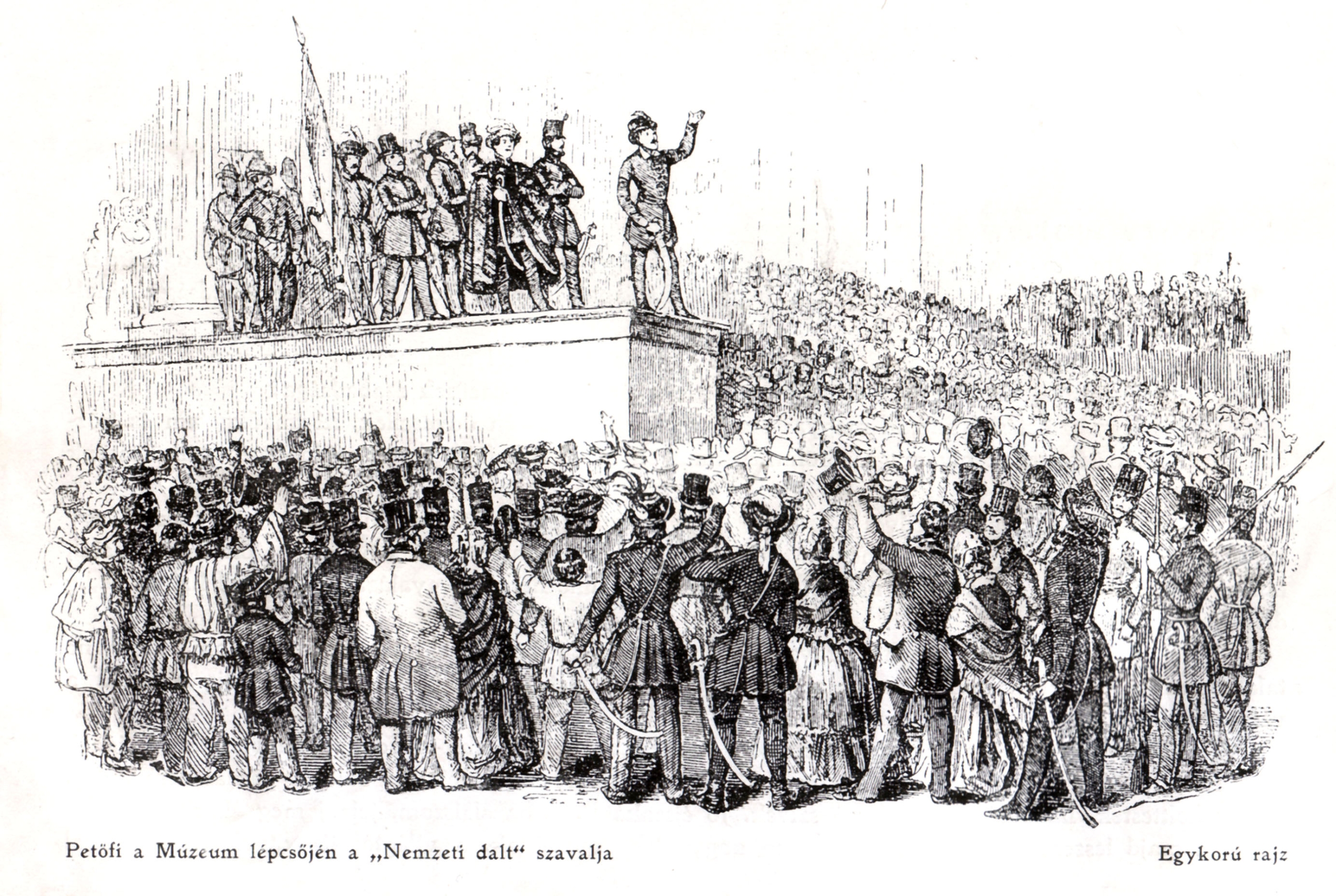 A „Pilvax-kör” – többek között Petőfi Sándor, Jókai Mór, Vasvári Pál és Bulyovszky Gyula – március 14-én este elhatározta, hogy a bécsi forradalom nyomán cselekvésre szánja el magát. Március 15-én délelőtt mozgósították az egyetemi ifjúságot, felolvasták a 12 pontot, amelyet később Landerer és Heckenast nyomdájában a Nemzeti dallal együtt, cenzori engedély nélkül kinyomtattak. Ezt tartjuk a magyar sajtószabadság megszületésének, nem véletlen, hogy március 15-e a magyar sajtó napja is. Délután háromkor a Nemzeti Múzeumnál tartottak egy nagygyűlést, majd a tízezresre duzzadt tömeg a hajóhídon átvonult Budára, ahol hivatalosan is életbe léptették a 12 pontban foglalt követeléseket, és kiszabadították az állítólagos sajtóvétség miatt bebörtönzött Táncsics Mihály újságírót, akit a tömeg diadalmenetben vitt Pestre. Este a Nemzeti Színházban a betiltott Bánk Bán előadásával ünnepelték a forradalom győzelmét.